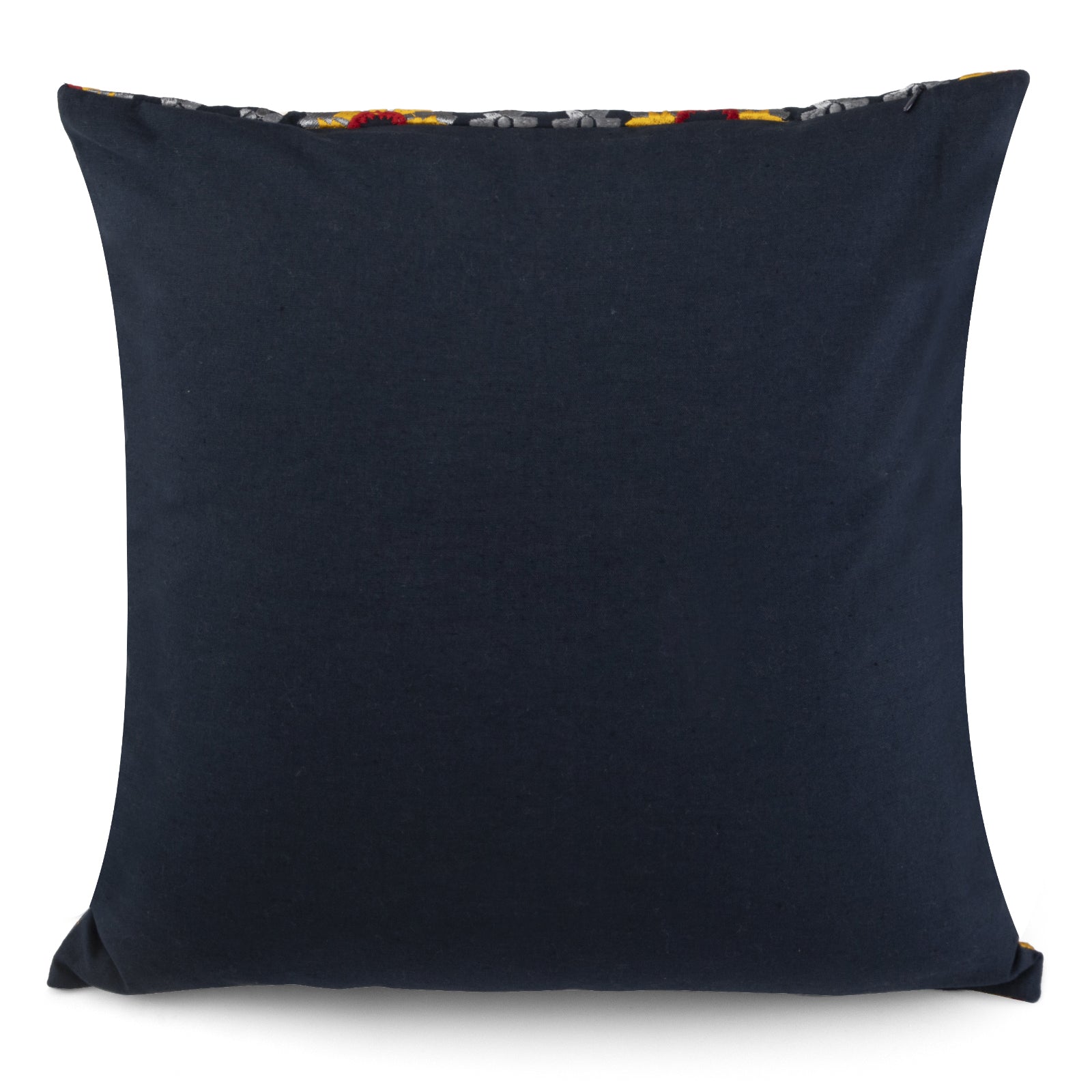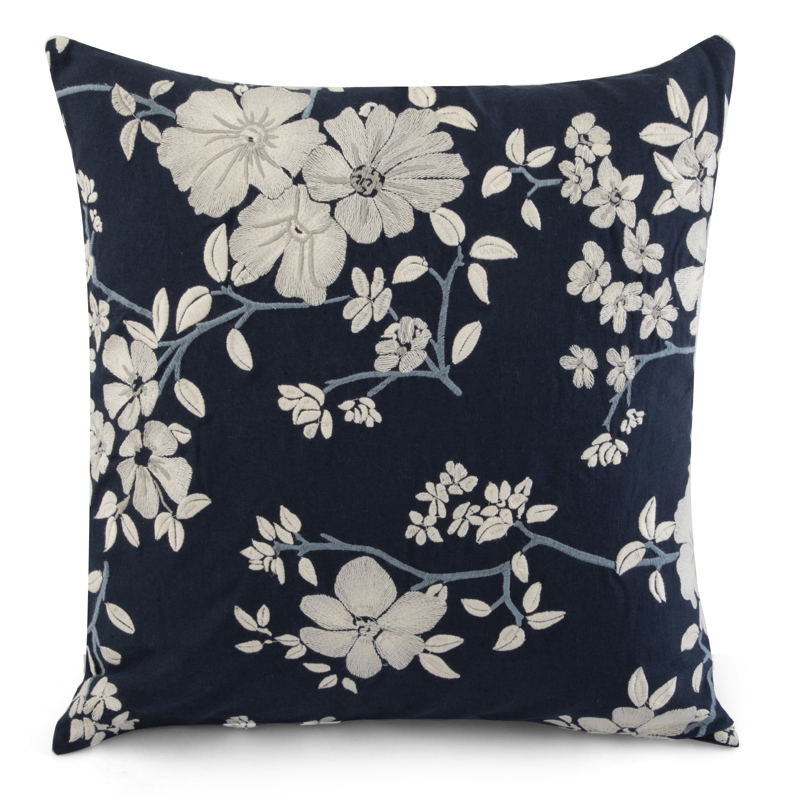 A luxurious addition to any room. The deep navy blue cotton base paired with intricate, computerized embroidery of delicate floral patterns creates a striking and elegant piece. The perfect accent to any living or bedroom decor, this cushion will add richness and sophistication to your space.