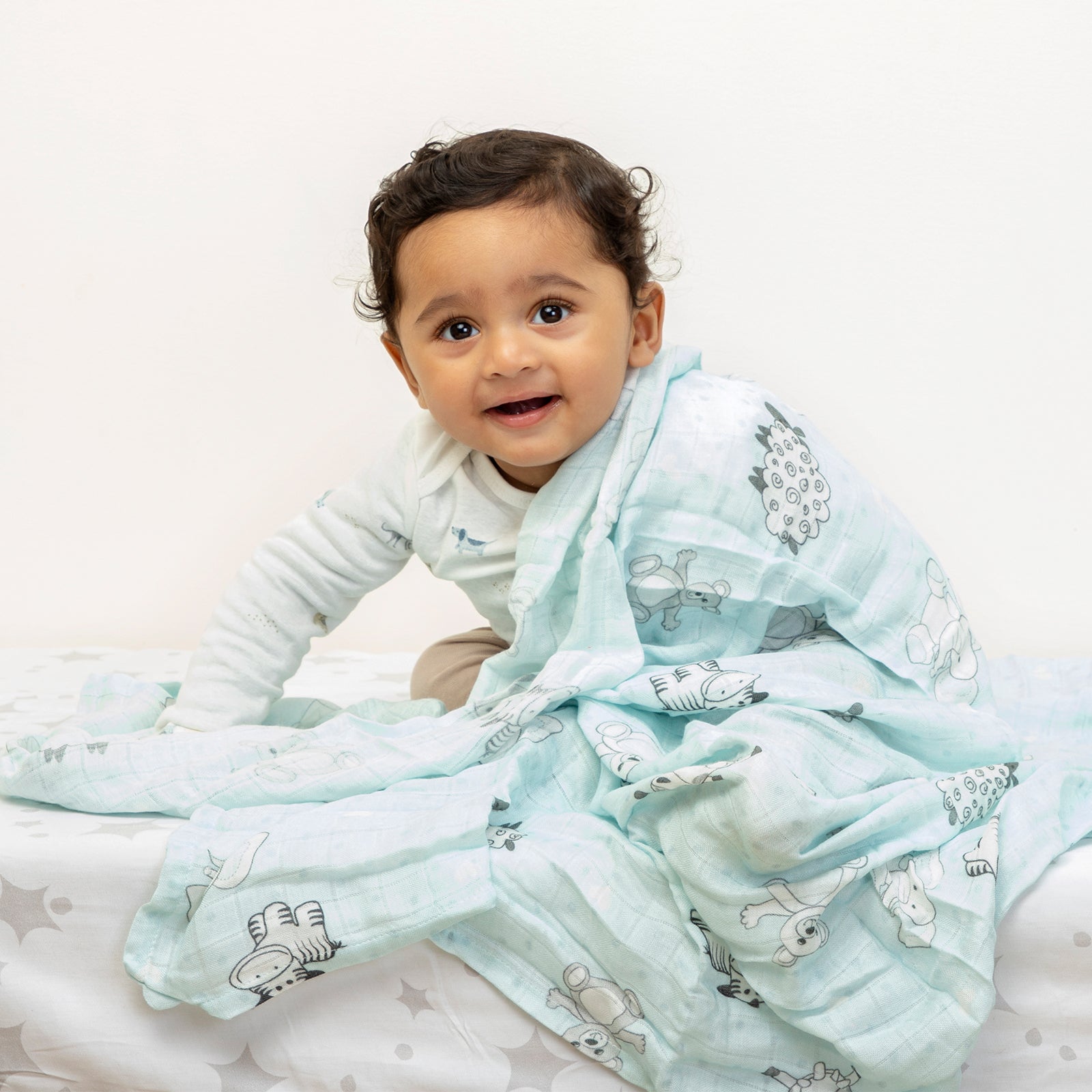 Cuties bamboo muslin swaddle wrap - featuring playful and adorable animals in a soft blue dotted and heart background. Perfect for snuggling your little one and ensuring a good night's sleep. Add this sweet and fun design to your baby collection today!