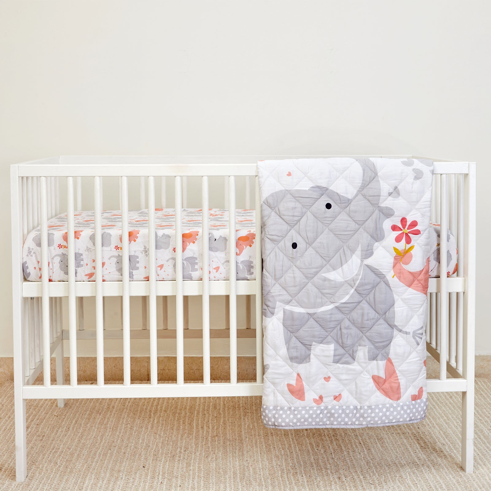 Elle Collection, our charming range of baby crib sets featuring an adorable elephant design in soft pastel shades of grey and baby orange. This collection also includes a coordinated dotted grey/white fabric in the bolster, pillow, and quilt back, creating a beautifully attractive set . Made from premium bamboo fabric, this collection is gentle on your baby's delicate skin and perfect for creating a cozy and inviting nursery. The bamboo fabric is oeko-tex certified, ensuring it's free from harmful chemicals. Bring a touch of whimsy to your baby's sleeping space with the Elle Collection today!