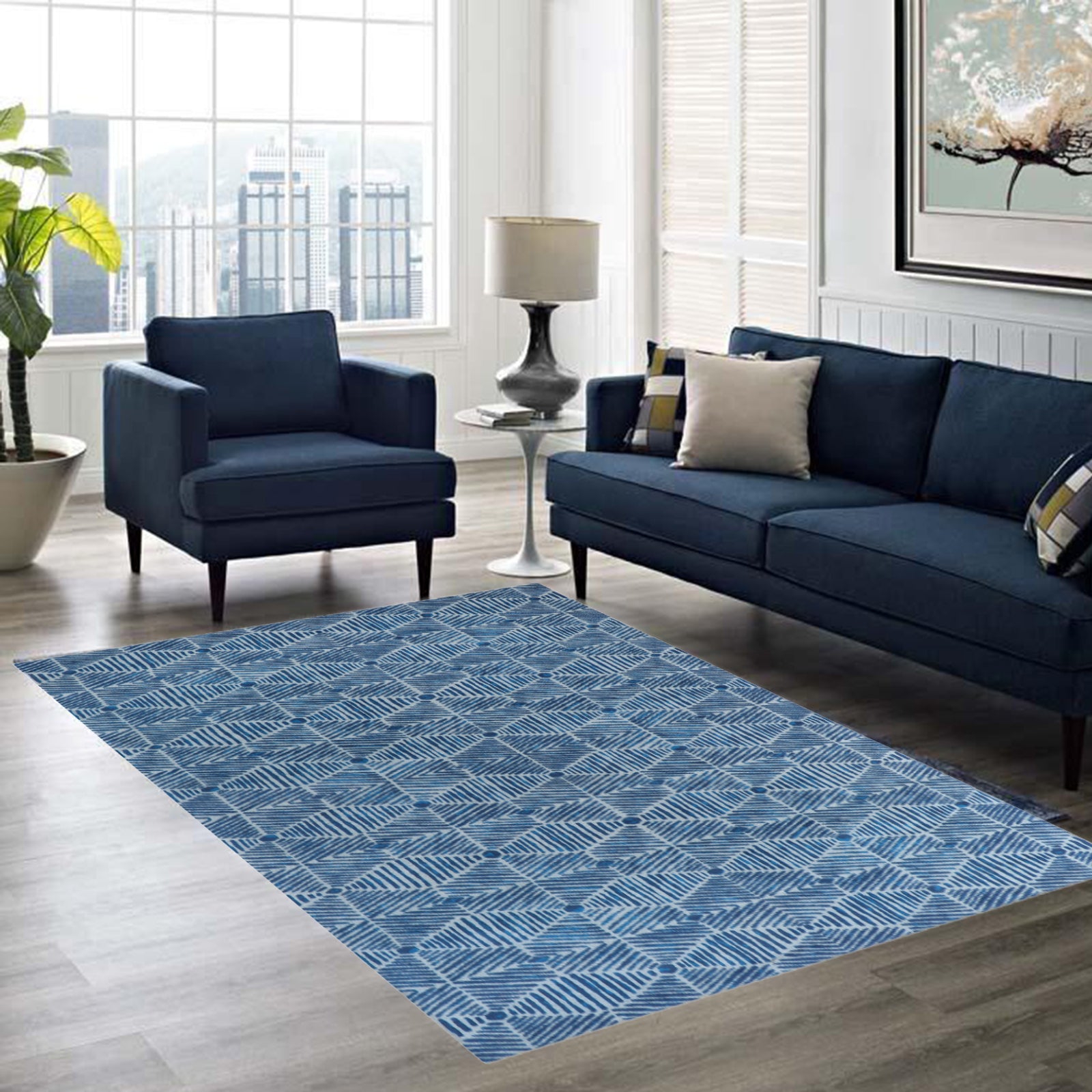 Our Geo Rug is simple yet stunning lined geometrical pattern in tonal blue colours of this rug is sure to add a wow factor to any room. The clean and modern design makes it a great statement piece without being too overwhelming. Its versatile colour scheme and unique design make it a perfect fit for any home décor style.