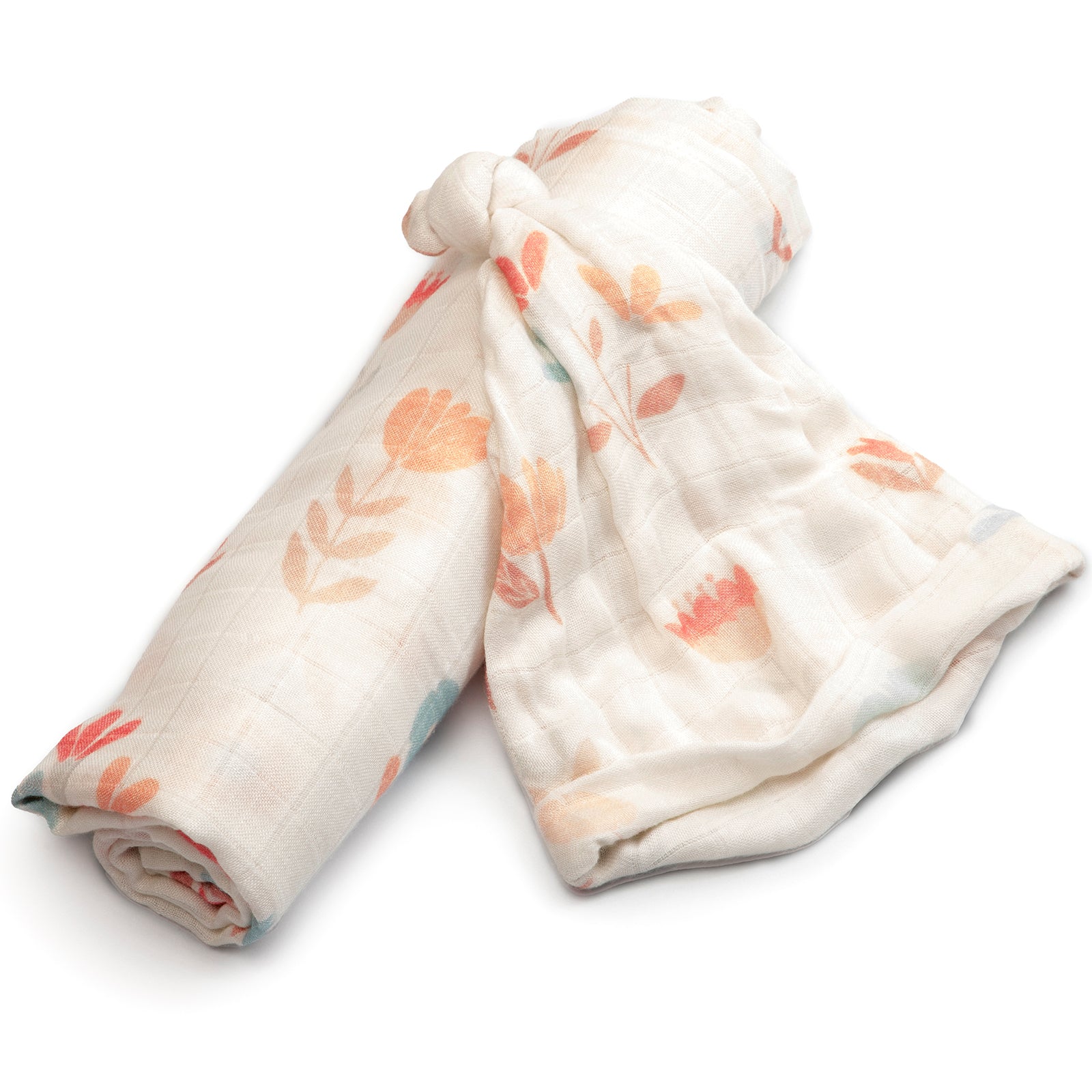 Blossom! our beautiful bamboo muslin swaddle wrap, features a delightful floral and leaf pattern in soft pastel pink with a touch of blue, making it the perfect addition to your baby's collection. Order now and wrap your little one in comfort and style! Don't miss out on this lovely product.