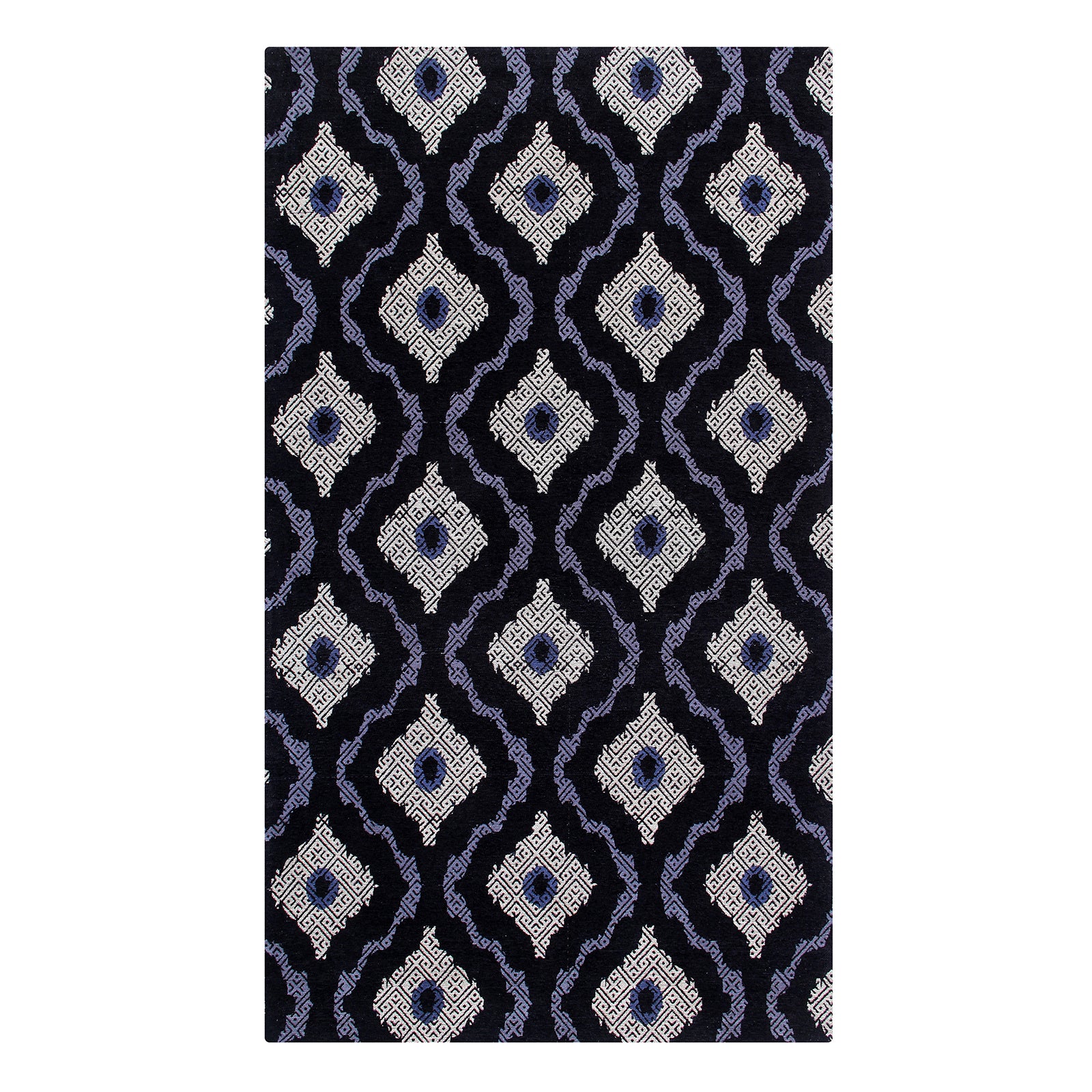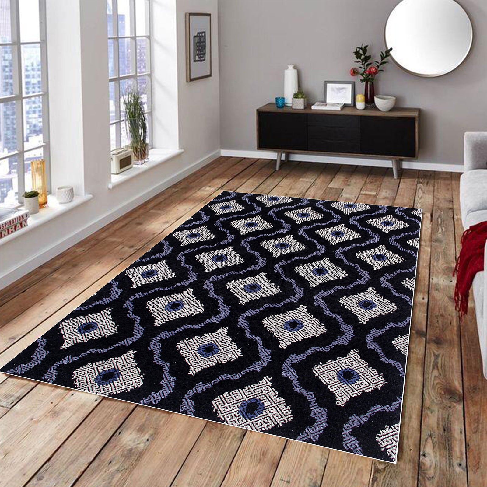 With our Medallion rug elevate your home decor with this elegant black-colored rug featuring a modernized ogee pattern with touches of grey/blue and off-white colors. The beautiful inside detailing adds a punch of modern graphic touch to any room. Crafted with a flat woven cotton base, this rug is not only luxurious to the touch but also easy to maintain, making it a perfect addition to your living room, bedroom or any other space in your home.