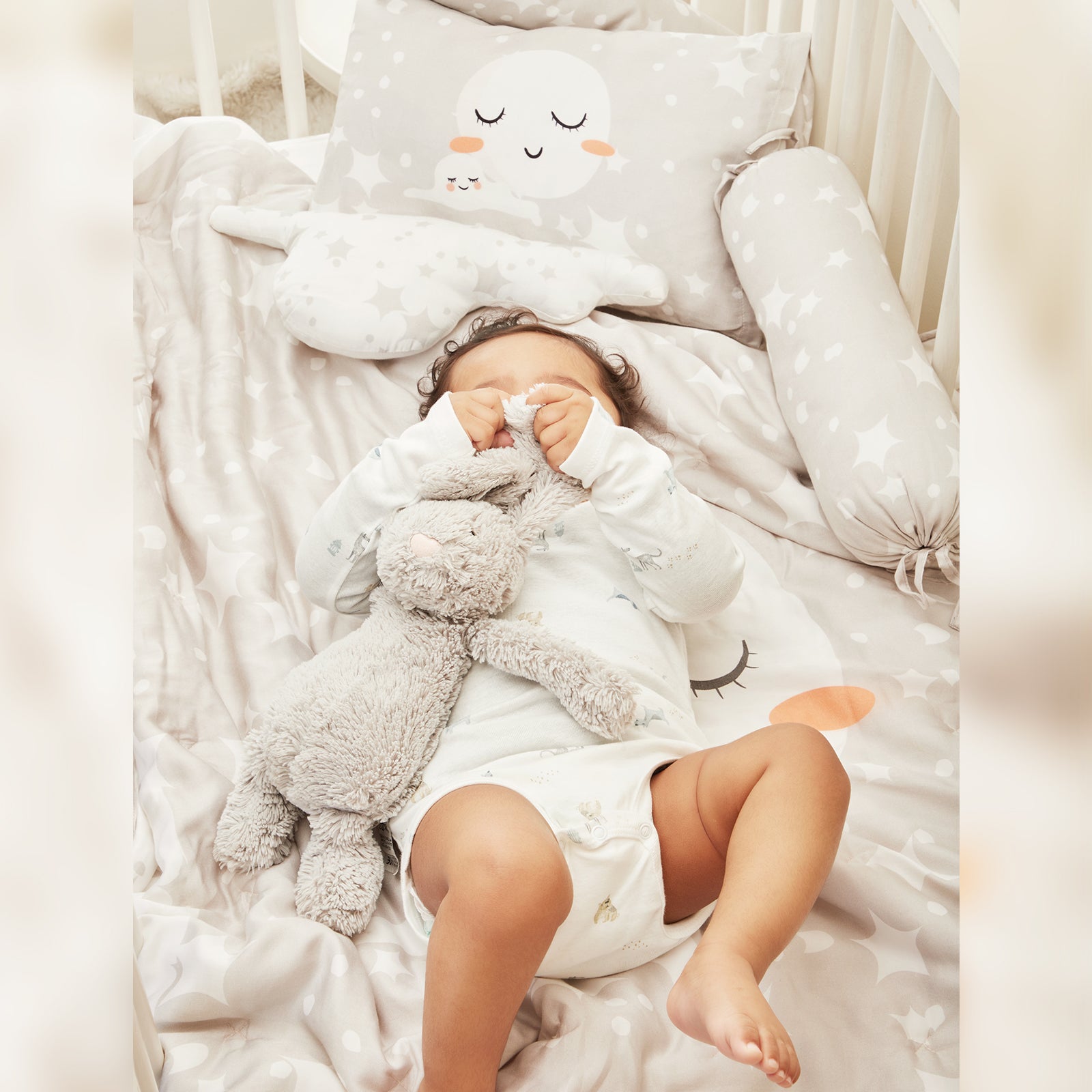 Moonlight Crib set Collection, our dreamy range of baby crib sets featuring a beautiful and very soft pastel grey and white print that creates the peaceful effect of moonlight. The smiley moon and floating cloud design will transport your baby to a peaceful dreamland. This collection also includes a charming shaped cloud cushion to add extra charm. Made from premium bamboo fabric, this collection is gentle on your baby's delicate skin and perfect for creating a cozy and inviting nursery. The bamboo fabric is oeko-tex certified, ensuring it's free from harmful chemicals. Create a serene and enchanting sleeping space for your little one with the Moonlight Collection today!