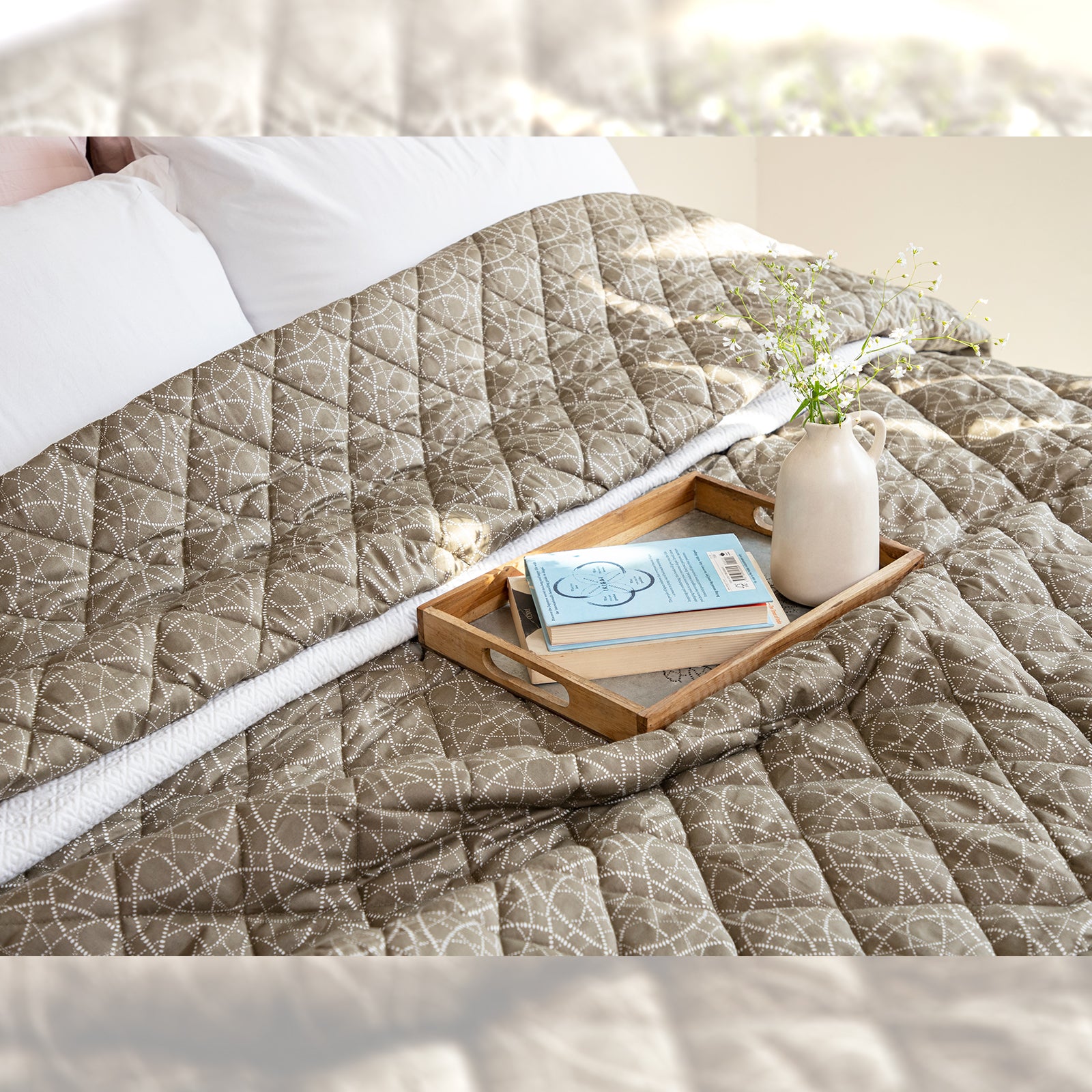 "Spatial" Quilted comforter - a perfect addition to your bedroom decor. The olive green color with its all-over geometric design and dotted pattern makes it stand out. The diamond-shaped quilting pattern adds an extra layer of elegance to this piece. Made with 100% cotton, this comforter is both soft and comfortable. Get ready to snuggle up in style!