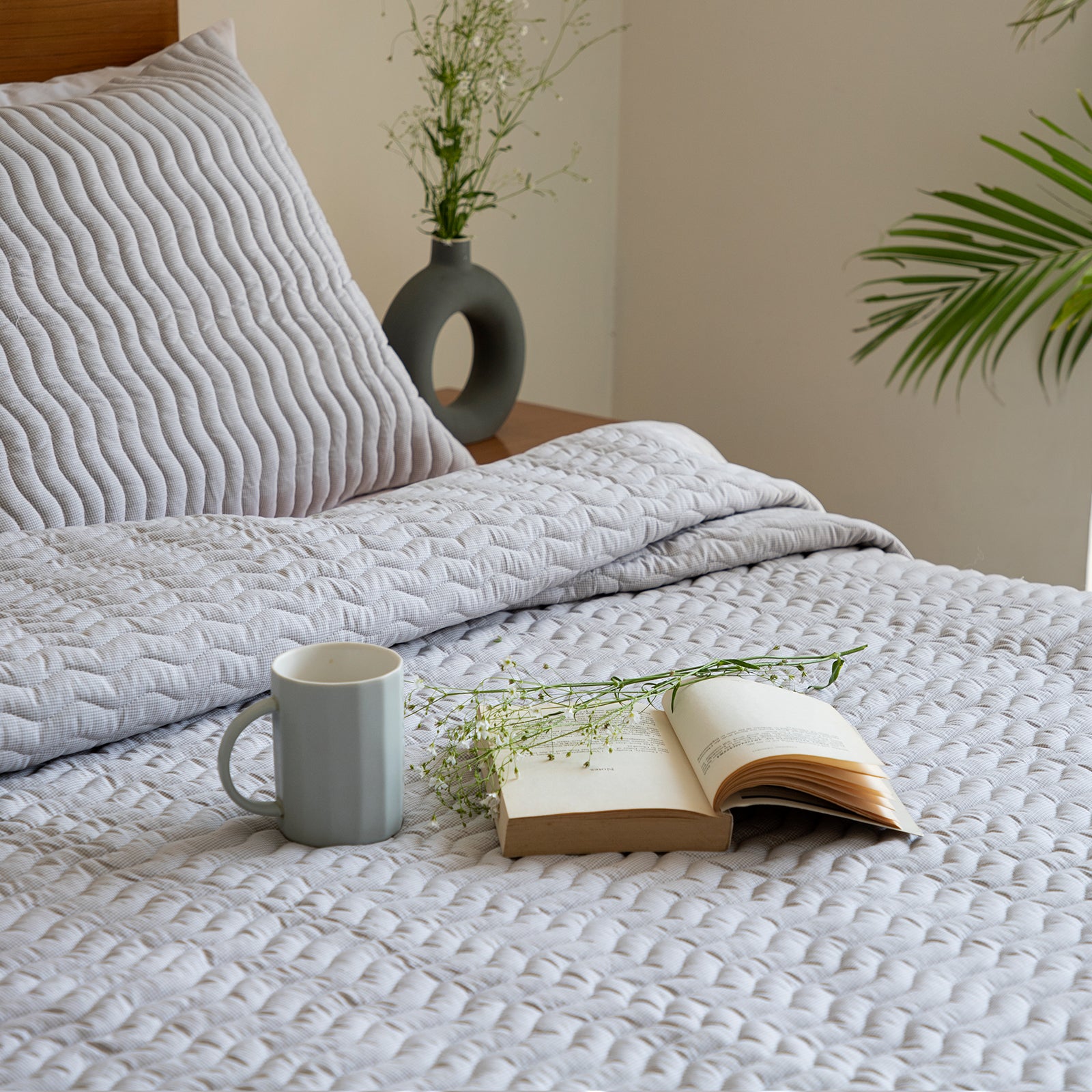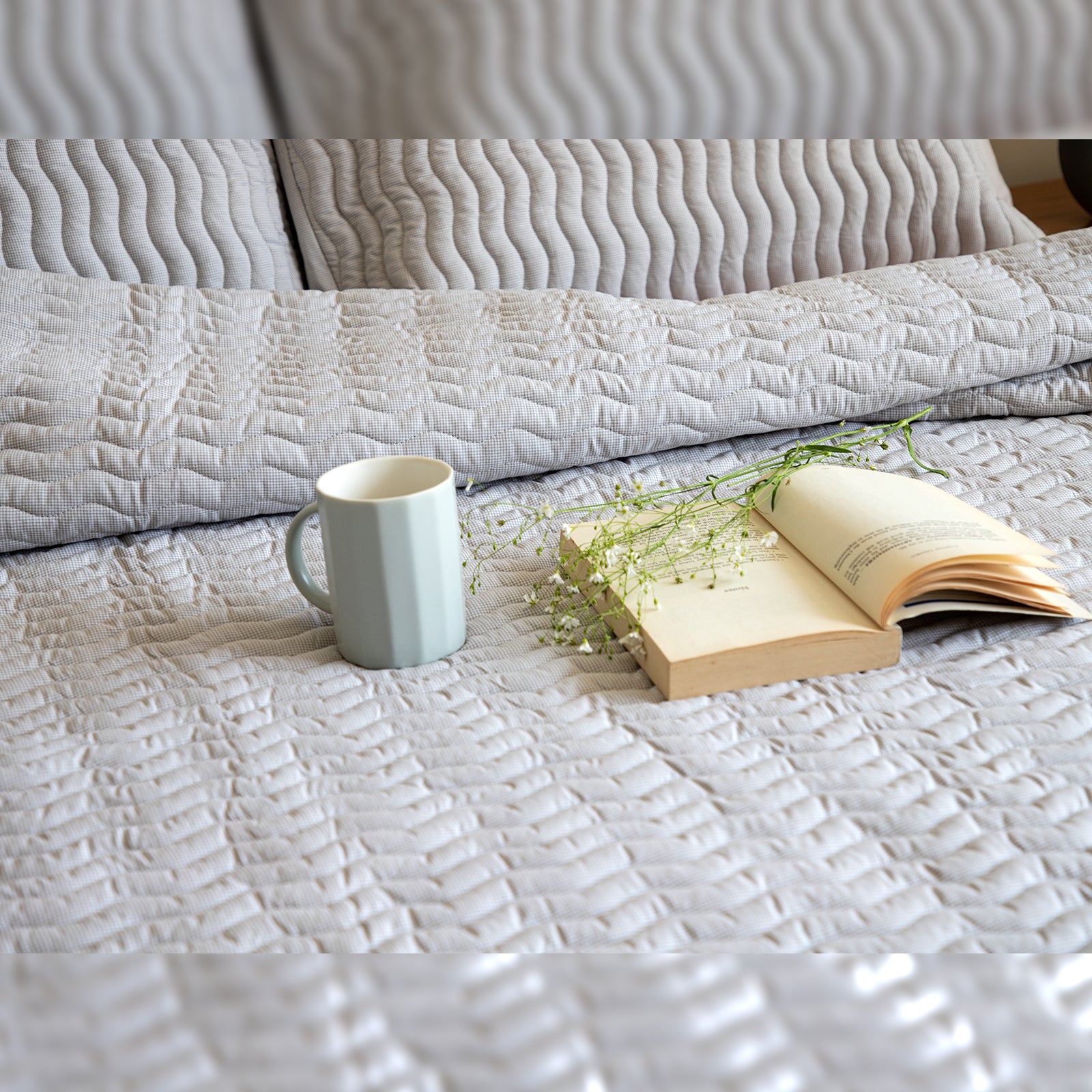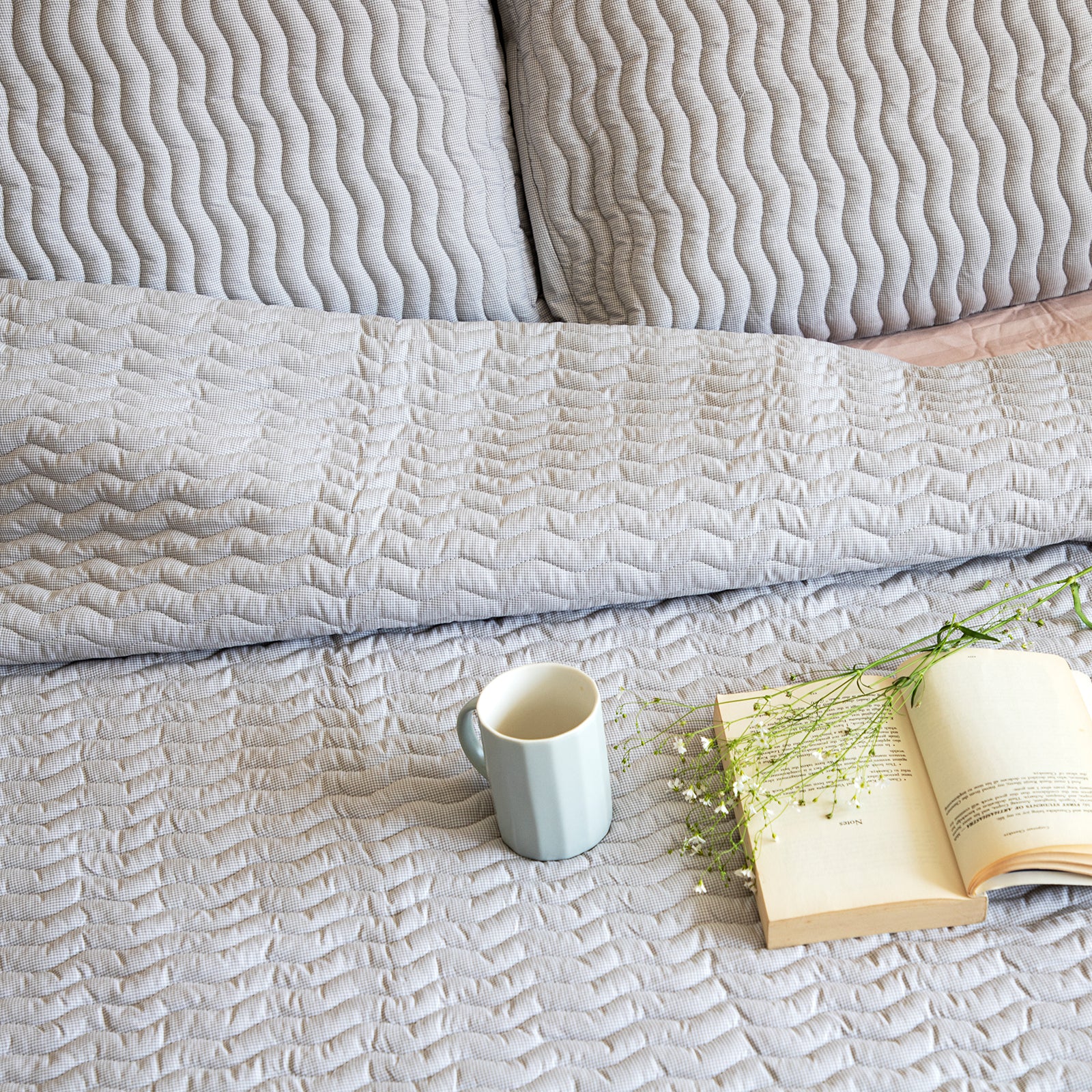 Quilted comforter "Twine", a beautiful addition to your bedroom decor. With its elegant fine check pattern in white and soft grey color scheme, it will easily match any interior style. The wavy quilted pattern adds an extra touch of luxury to this already stylish piece. You won't want to miss out on this perfect combination of design and comfort.